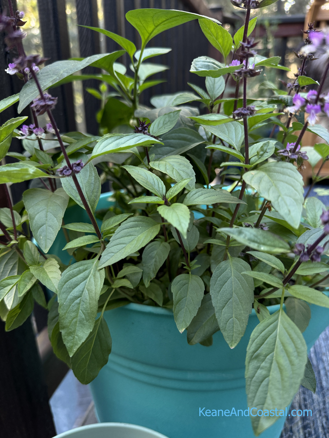 My Thai basil is currently flowering with beautiful little purple blooms. I moved them from my hydroponic garden tower to a pot outside so they could continue growing and produce seeds. The basil was easy to grow both hydroponically and in soil.